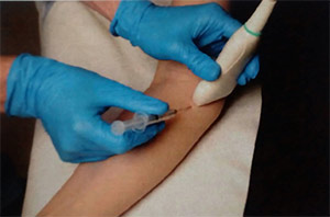 برای انجام این تزریق بیمار خوابیده به پشت قرار می گیرد و دست آسییب دیده در کنار بدن به صورتی قرار می گیرد که کف دست به سمت بالا باشد. سپس پزشک ساختار های داخلی محل تزریق را با دستگاه سونوگرافی شناسایی می کند و تزریق را انجام می دهد.