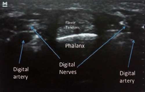 برای انجام این بلاک بیماری روی تخت می نشیند و دست مبتلا از بدن دور شده و به گونه ای قرار می گیرد که کف دست به سمت بالا باشد. محل تزریق دقیقا روی قاعده انگشت، در طرف کف دست است. پزشک با قرار دادن پروب سونوگرافی روی محل تزریق ساختار های داخلی را شناسایی می کند و تزریق را انجام می دهد.این تزریق هم جنبه درمانی و هم تشخیصی دارد.