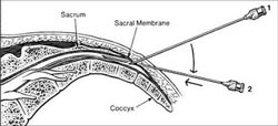 در این روش، سوزن در ساکرال هیاتوس (سوراخی در بالای دنبالچه) قرار می گیرد. در تزریق کودال نسبت به سایر روشهای تزریق اپیدورال، حجم بیشتری از دارو تزریق میشود. بسته به شدت درد، بین 10 تا 15 میلی لیتر دارو تزریق میشود.