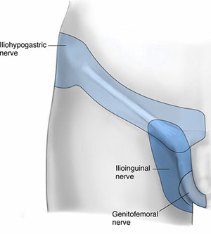 ناحیه عصب دهی شده توسط عصب ایلیوهایپوگاستریک با آبی کمرنگ نشان داده شده است: