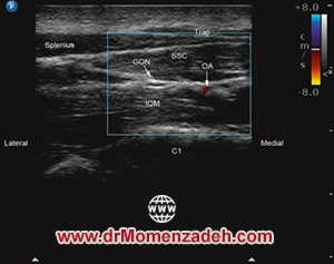 تصویر سونوگرافی نشان دهنده عصب اکسیپیتال بزرگ (GON) و شریان اکسیپیتال (OA):