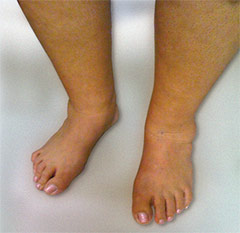 پای متورم بیمار مبتلا به رفلکس دیستروفی سمپاتیکی (پای چپ):