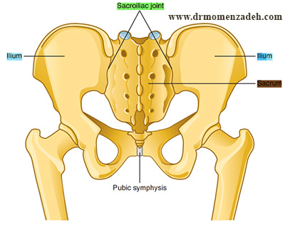 در تصویر زیر استخوان ایلئوم با رنگ آبی، استخوان ساکروم با رنگ قهوه ای و مفصل ساکروایلیاک با رنگ سبز نشان داده شده است: